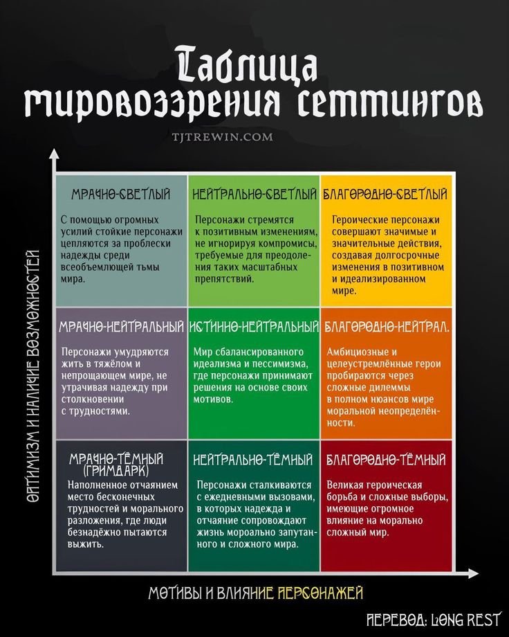 Эта таблица поможет глубже продумать сеттинг, не забудьте насытить его историями, которые раскроют причины такого положения дел в вашем мире, а также вы можете опираться на эту таблицу при создании сюжета.