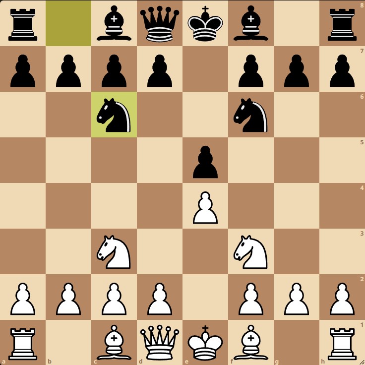 Однако Синдаров выбирает в этой позиции развивать своего коня, переводя партию в Дебют четырех коней: 3. Nc3 Nc6