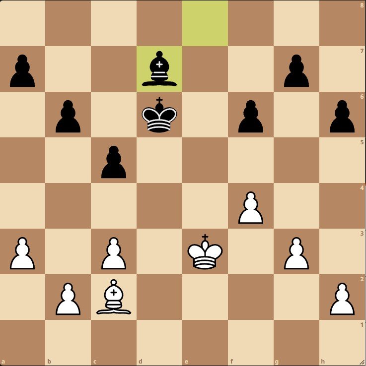 В этой позиции проиграть партию шахматистам такого уровня, конечно, практически невозможно, для этого нужно серьезно ошибиться, однако оба игрока делают крайне аккуратные ходы, расставляя пешки согласно правилу Капабланки: 21. f4 Kf8 22. Kf2 Ke7 23. Ke3 f6 24. c3 Kd6 25. Bd3 h6 26. a3 c5 27. g3 b6 28. Bc2 Bd7