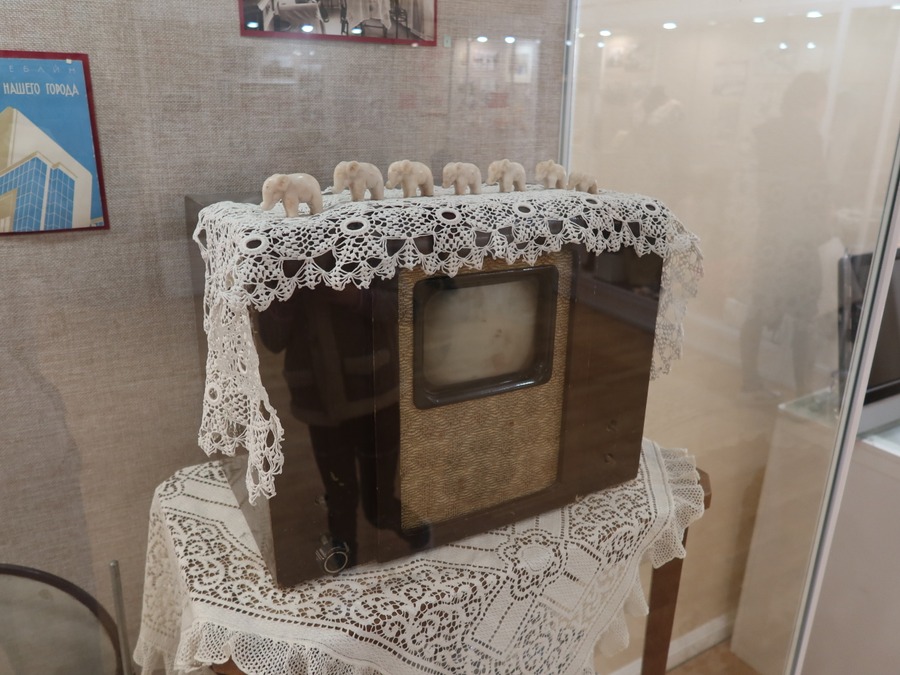 Телевизор с очень маленьким размером экрана. Сверху стоят слоники, у моего дедушки такие же были.