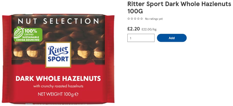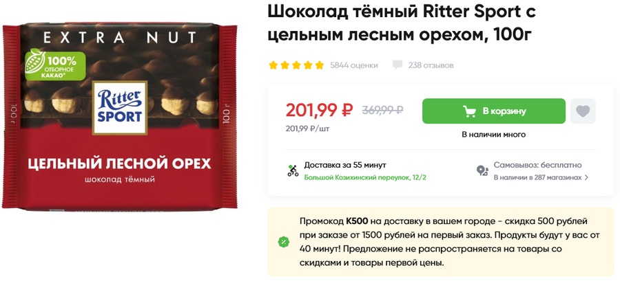 Со скидкой Риттер Спорт в Перекрёстке за 201 рубль.