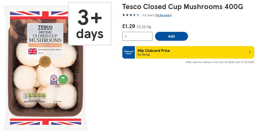 Шампиньоны 400 грамм, в Tesco эти грибы называются просто "грибы".