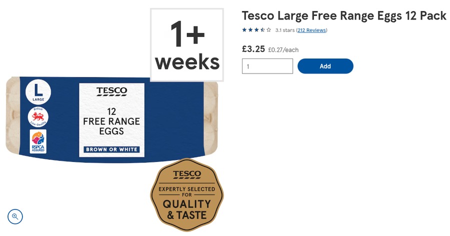 £3.25 за дюжину или 0,27 фунта за крупное яйцо, что примерно 28,53 рубля за яйцо.