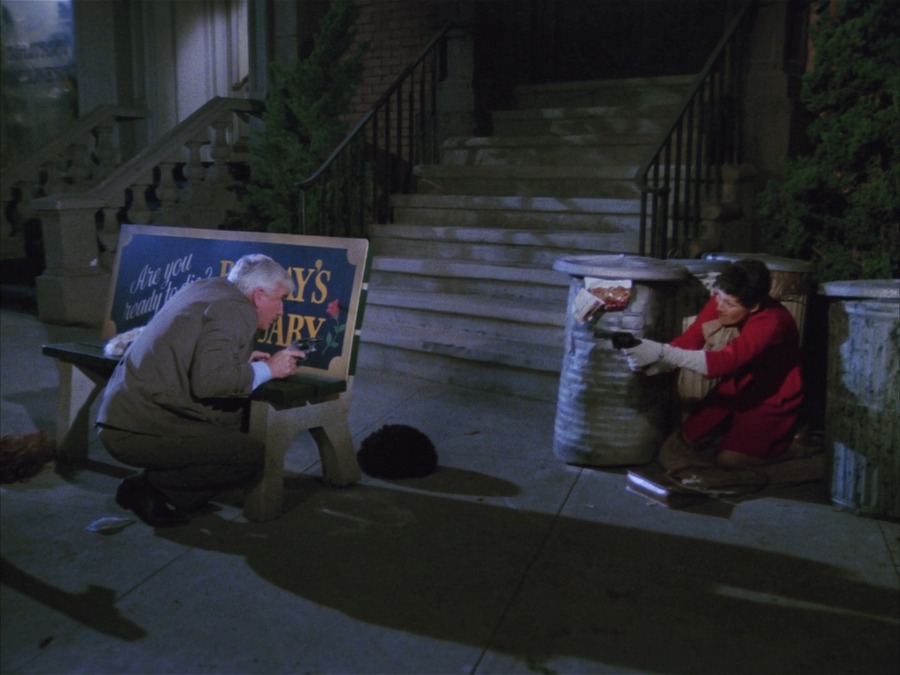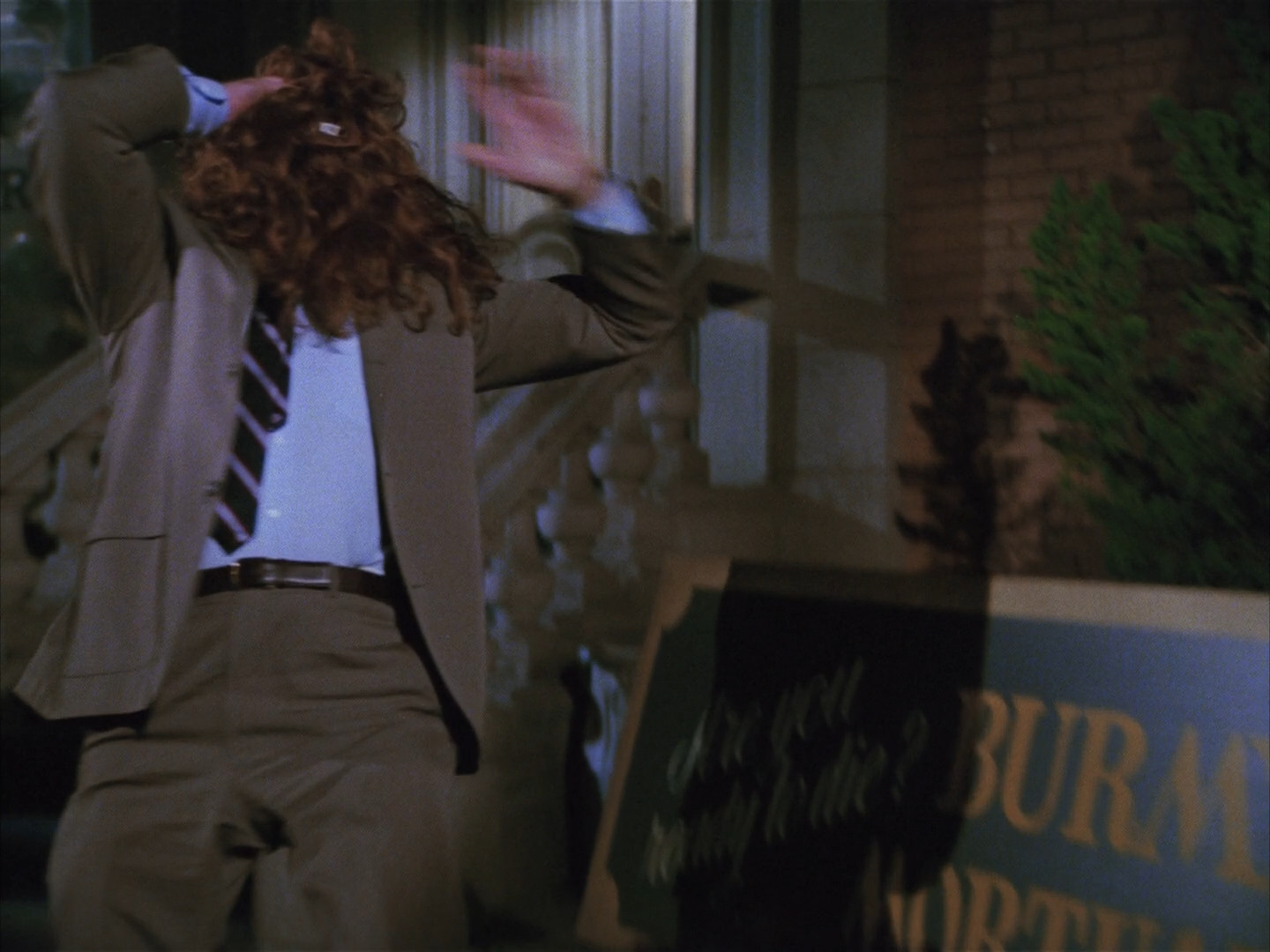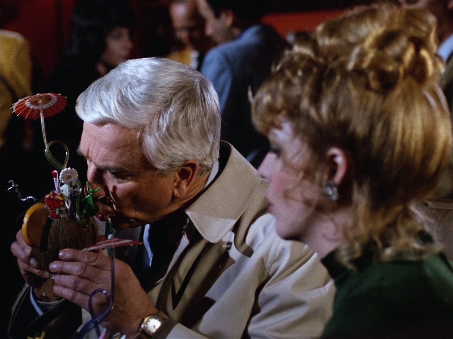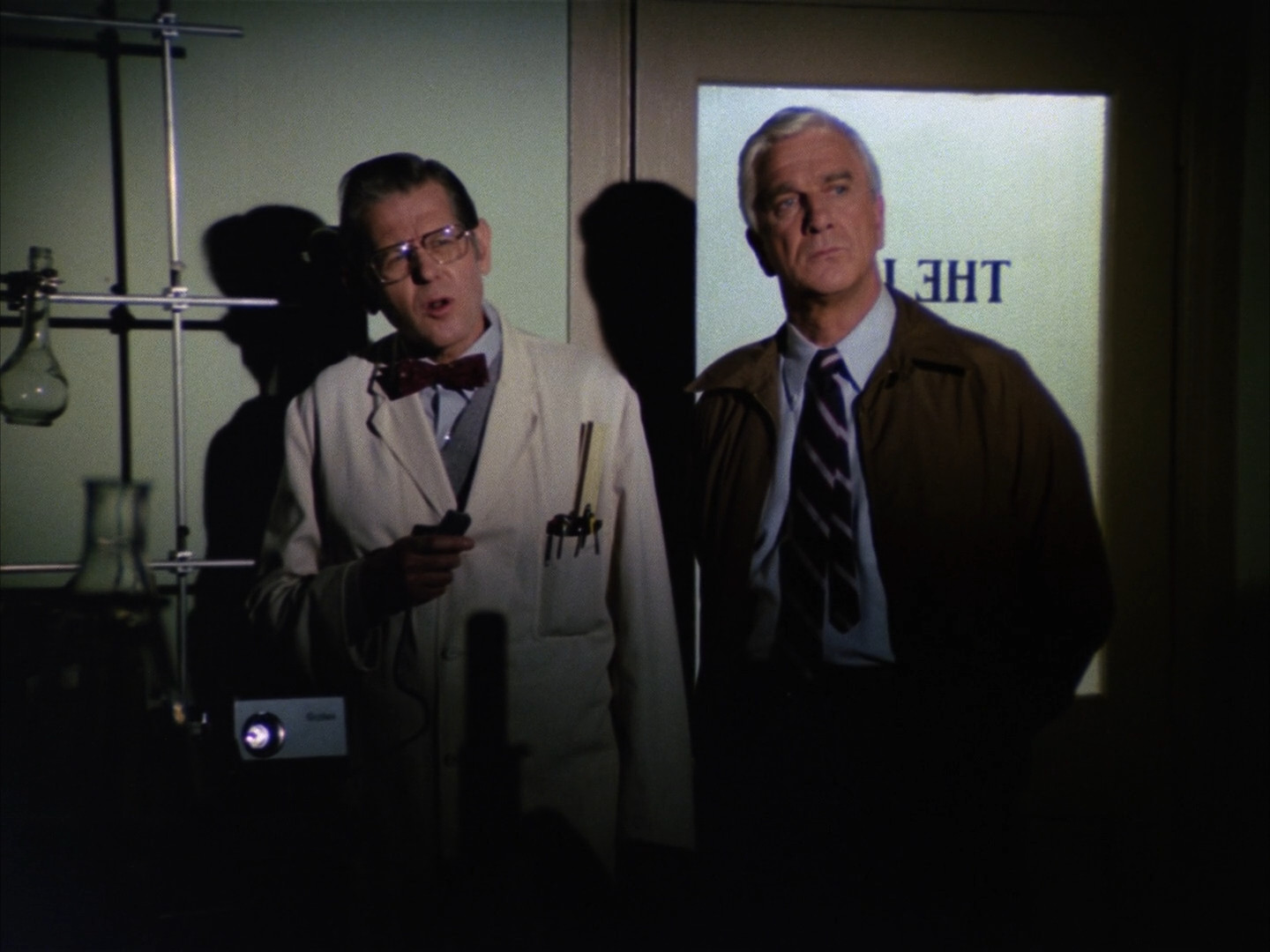 Девушка бросает Лесли Нильсену в лицо парик, он истошно кричит, "сражаясь" с ним.