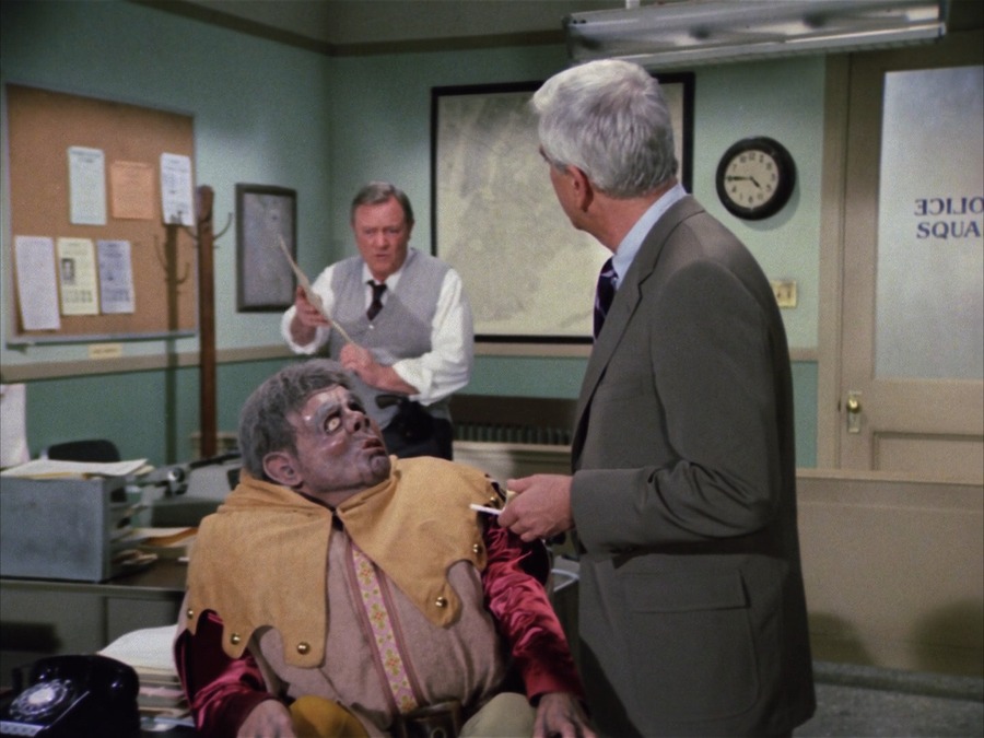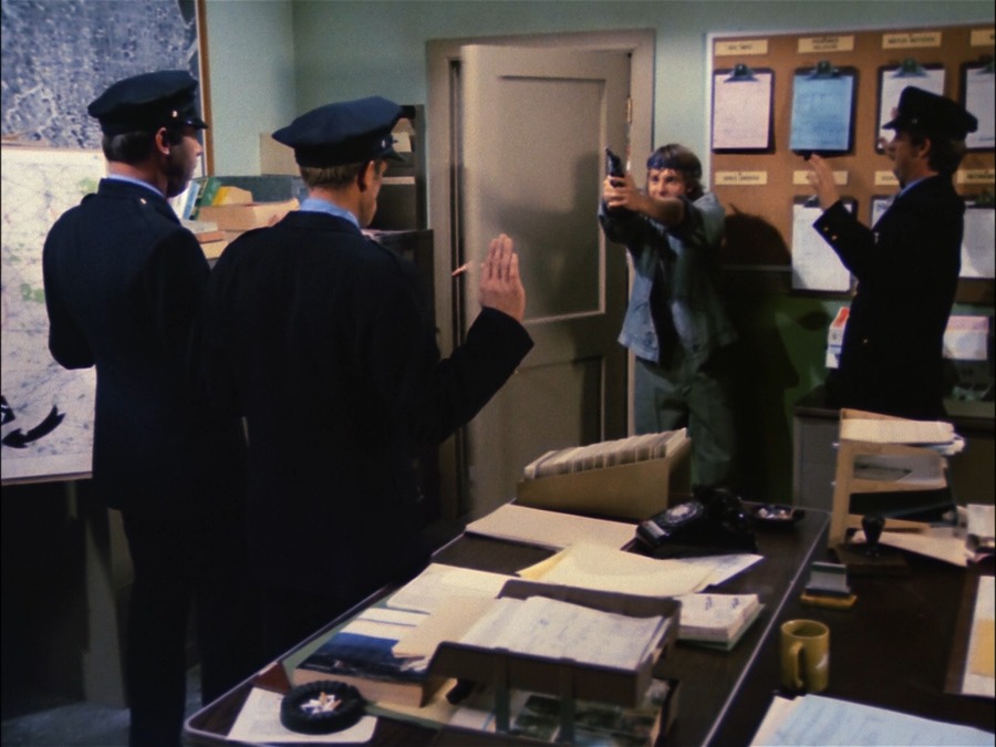 Преступник угрожает пистолетом полицейским в участке, но Дребин без всякой мысли "прибивает" его, широко распахивая дверь.