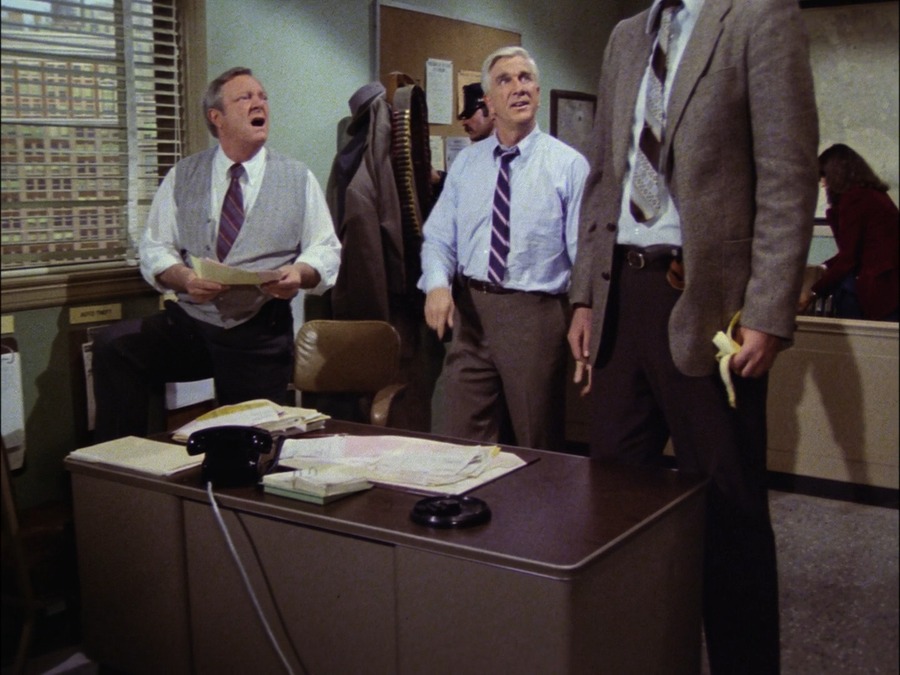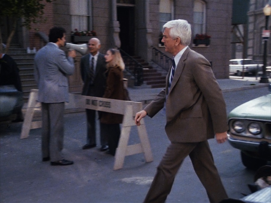Лесли Нильсен паркуется, врезаясь во что-то. В данном случае это другая машина. Прикол в разном виде тоже появляется чуть ли не в каждой серии.