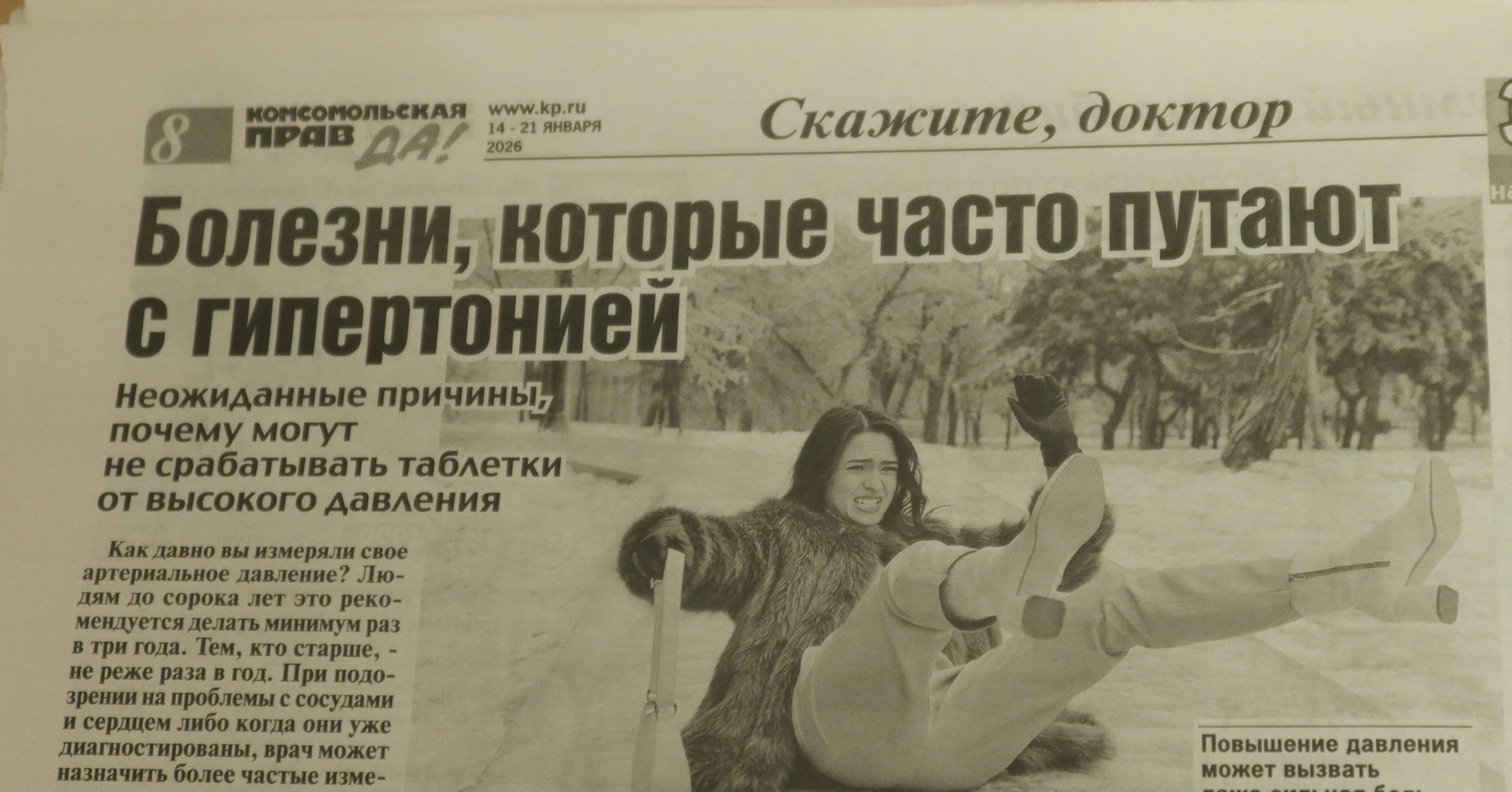 На другой странице желтушный материал про людей-киборгов, которые себе вживляют себе чипы и рядом целая страница с рекламой товаров на заказ для людей, которые не слышали про маркетплейсы. И опять тема про болячки в виде статьи "Болезни, которые часто путают с гипертонией".