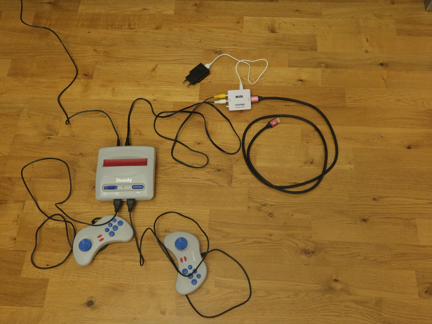 Дано: современная 8-битная приставка Dendy, вернее клон Денди из 90-х, которая в свою очередь была клоном приставки NES/Famicom. А также в наличии современный большой телевизор, у которого, к сожалению, нет MINI AV или RCA-разъёма (он же бело-жёлто-красный тюльпан). Кстати, у некоторых китайских производителей такие разъёмы до сих есть (Hisense, Haier), но в моём случае на телеке есть только HDMI. Сама приставка: