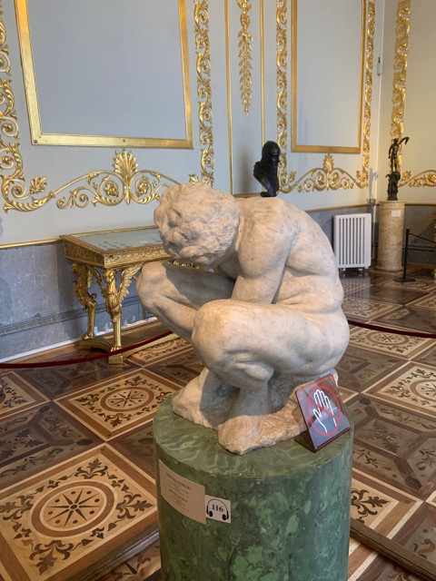 «Скорчившийся мальчик» 230-ом зале Эрмитажа. Статуя скорей всего была, сделала для капеллы Медичи во Флоренции, так указано в документах коллекционера Лайда Брауна, откуда она и попала в Россию. Скульптура запуталась во мнениях искусствоведов: мальчик-аллегория тяжелого периода республики Флоренция? Или ребенок вытаскивающий занозу? У него нарушены пропорции, он не сможет подняться.