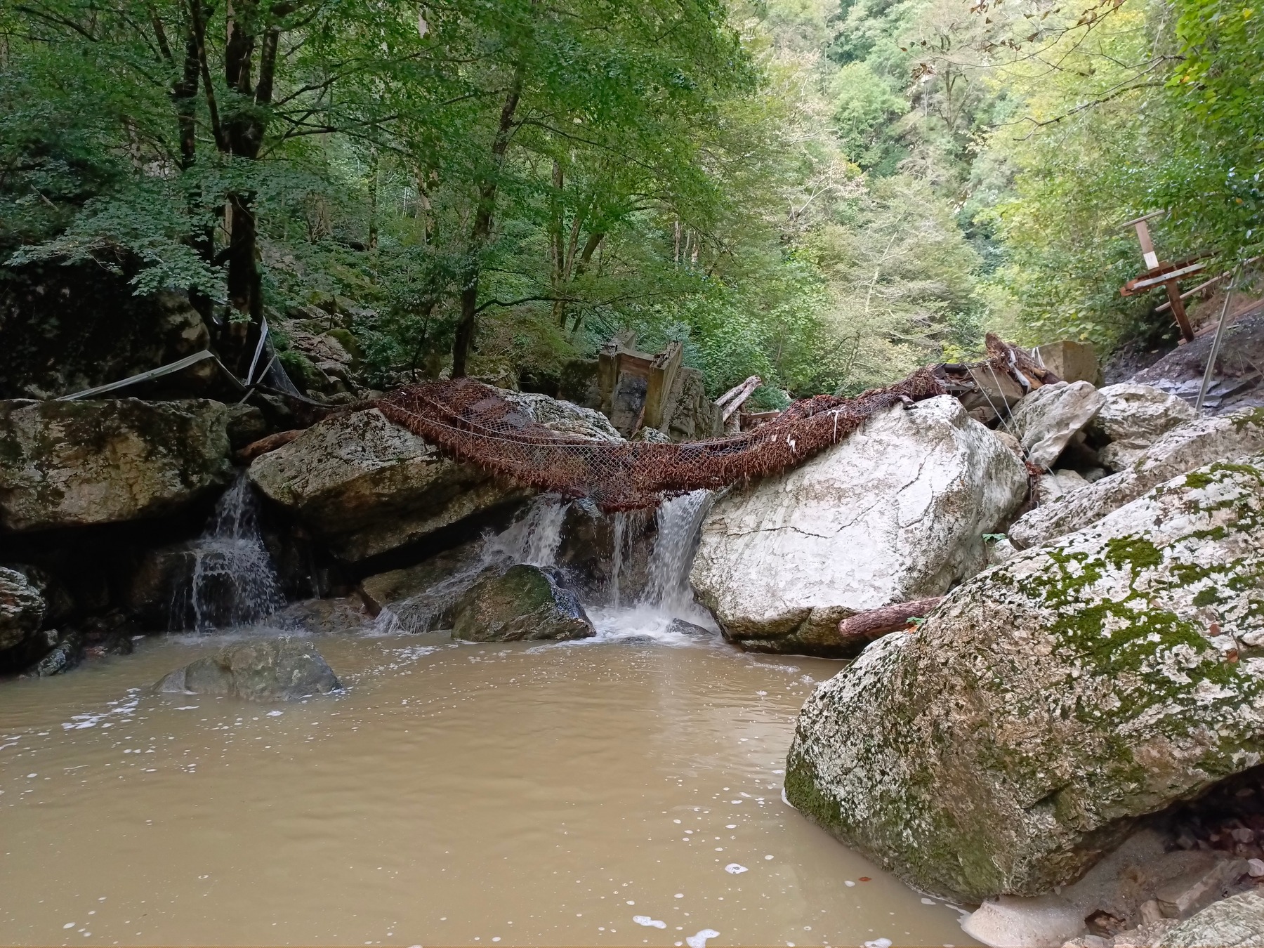 Первый человек, встретившийся нам на пути, и, видимо, уже возвращающийся, сказал, что до водопадов дойти можно, только если перейти реку, так как мост снесло. Ага. Постояли, подумали и двинулись дальше… Посмотрим, что там такое случилось. Минут через двадцать топания по узкой тропинки дошли моста… И действительно от него практически ничего не осталось.