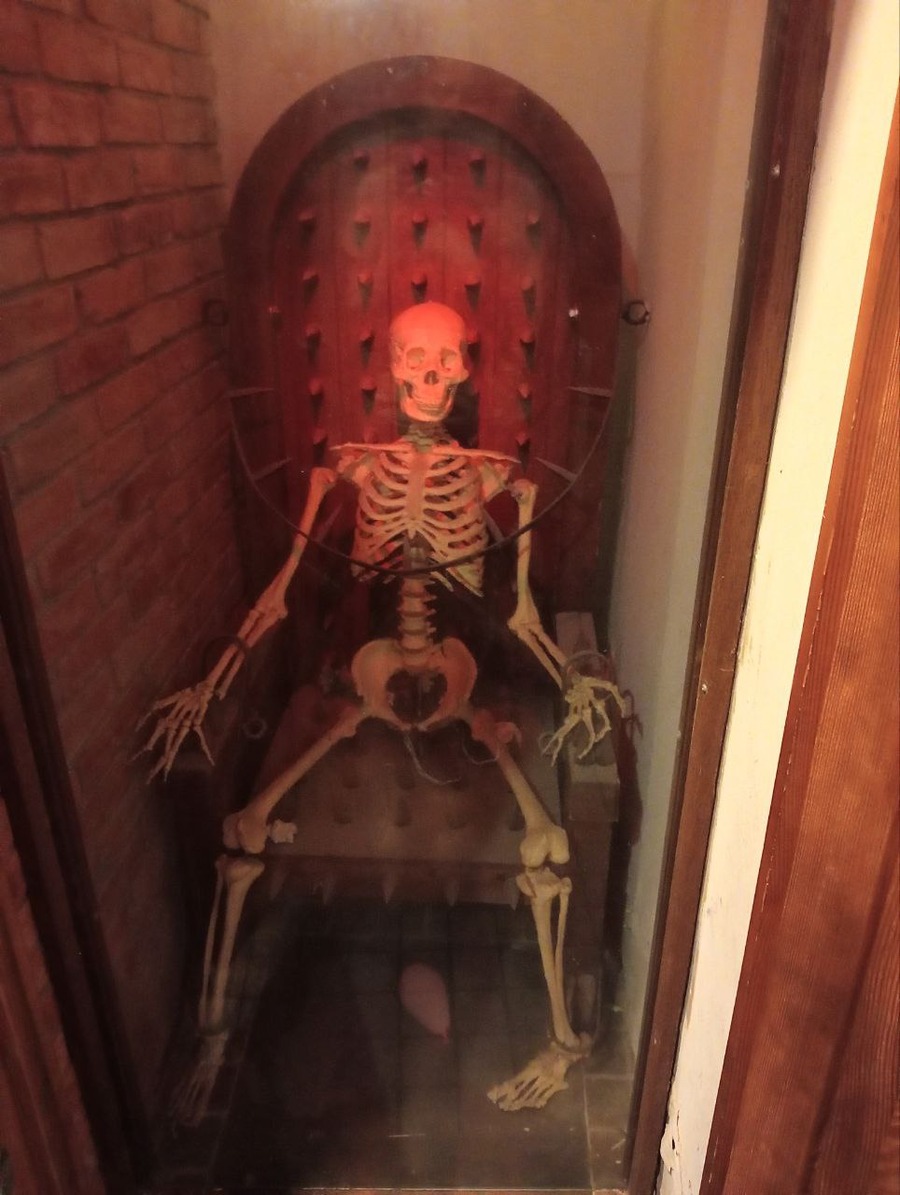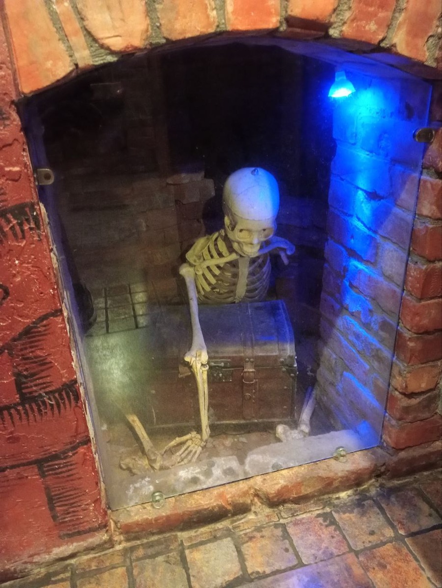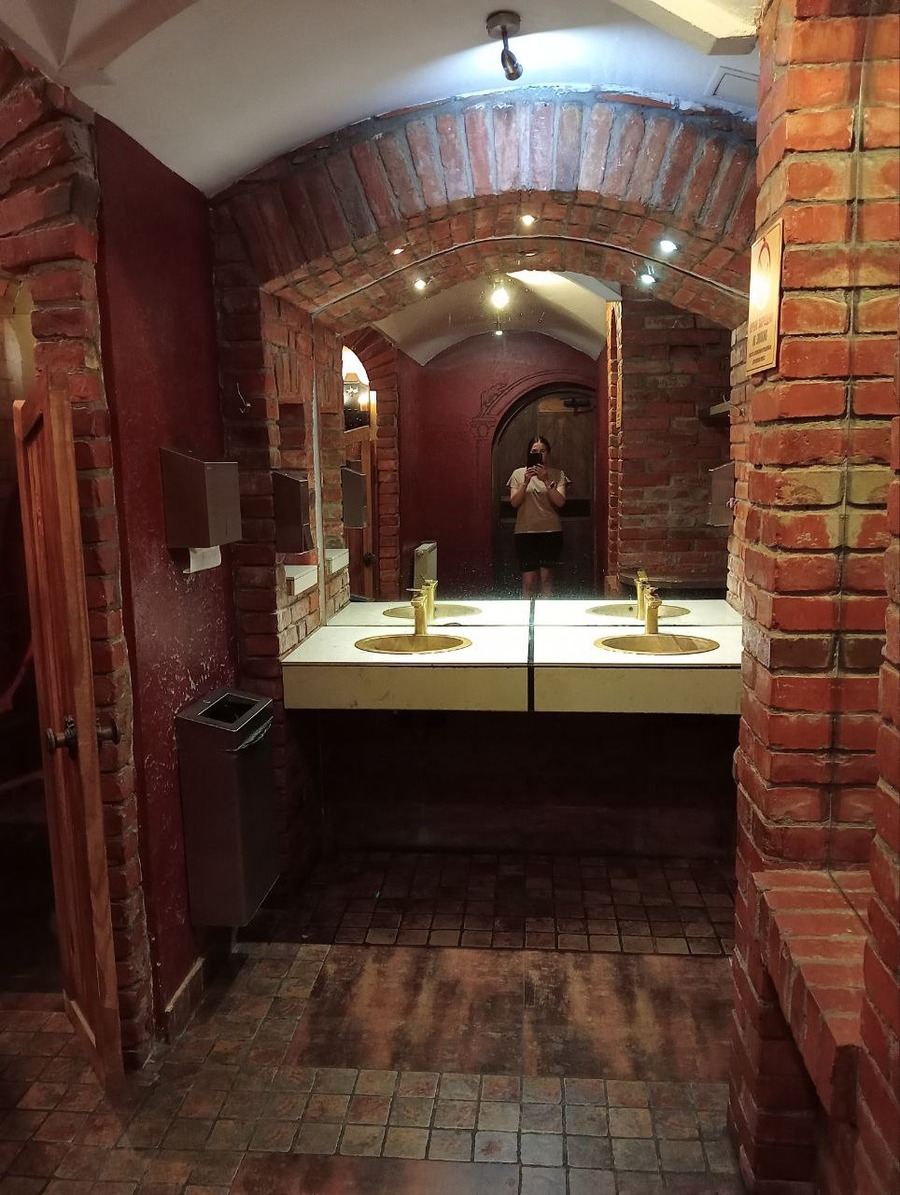 Но отдельную пятёрку с плюсом я хочу отдать за дизайн туалетов. Логично, что он выполнен в том же средневековом стиле, но найти в одной из кабинок не унитаз, а скелет — это просто эффект "Вау!". Конечно же, сантехника и техника новые, но внутри этого практически не замечаешь, так как голова крутится в разные стороны. Так неосмотрительно, можно и на обувь написать, если засмотришься :-)