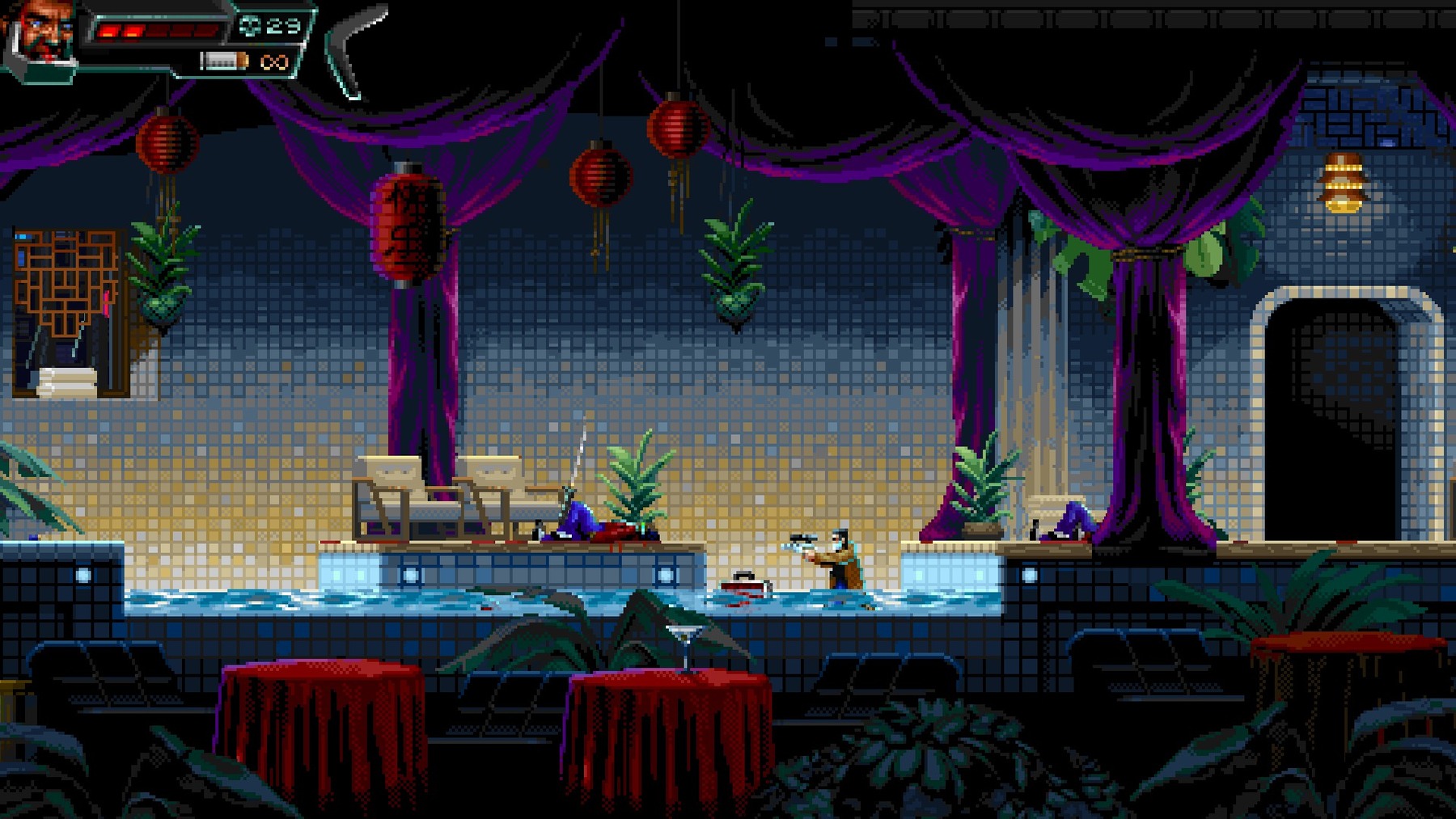На средней сложности игра в меру сложная, как раз для рядового уставшего после работы геймера! Были пару раз затыки (например, с чуваком на ринге), но усердие всё порешало. А так, здесь не нужно ничего заучивать и перепроходить сотню раз, это правильный подход в гейм-дизайне для run-and-gun.