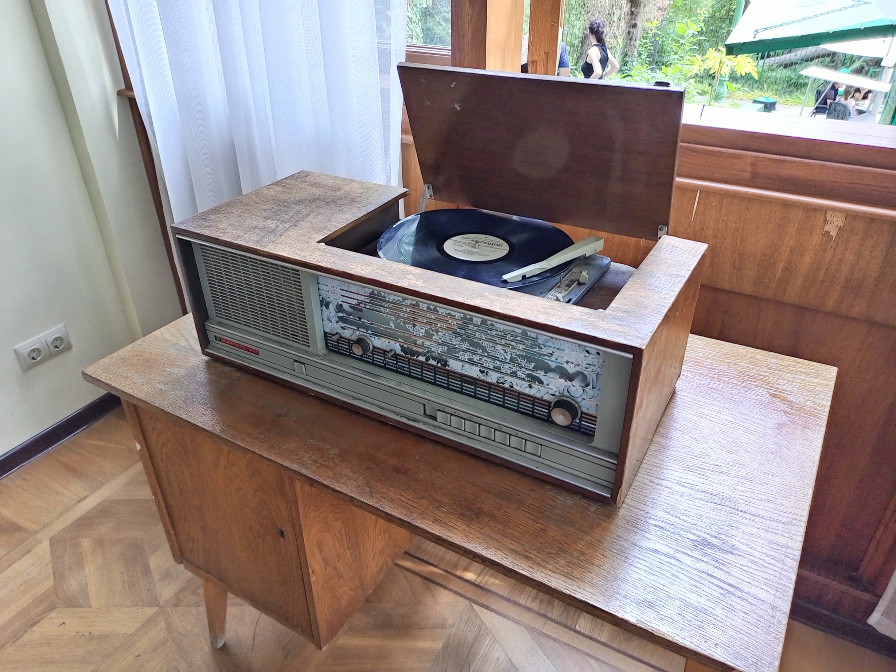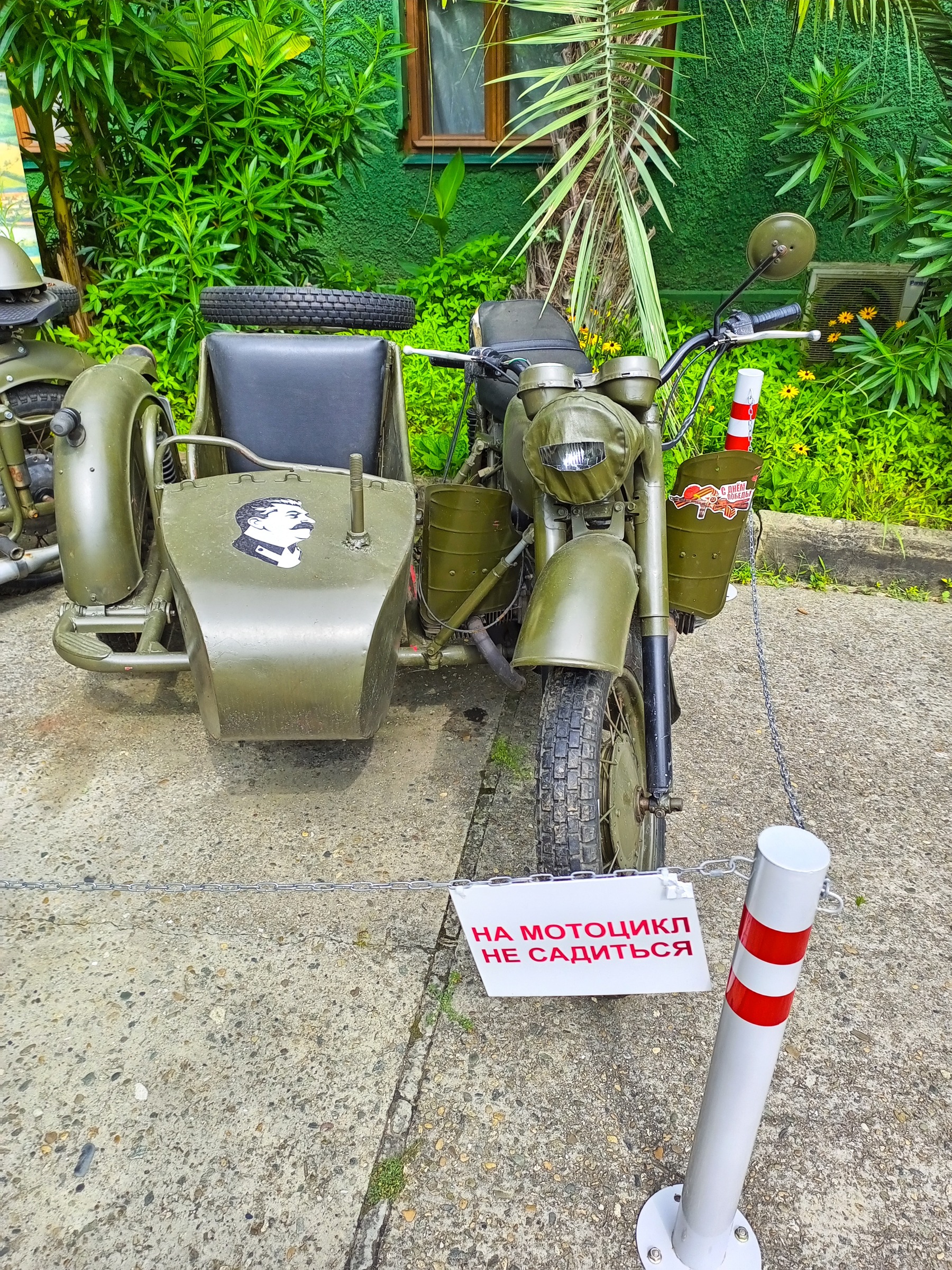В красивом пестрящем разными цветами саду стоит мотоцикл, на котором, якобы, Сталин появлялся на фронте во время ВОВ.