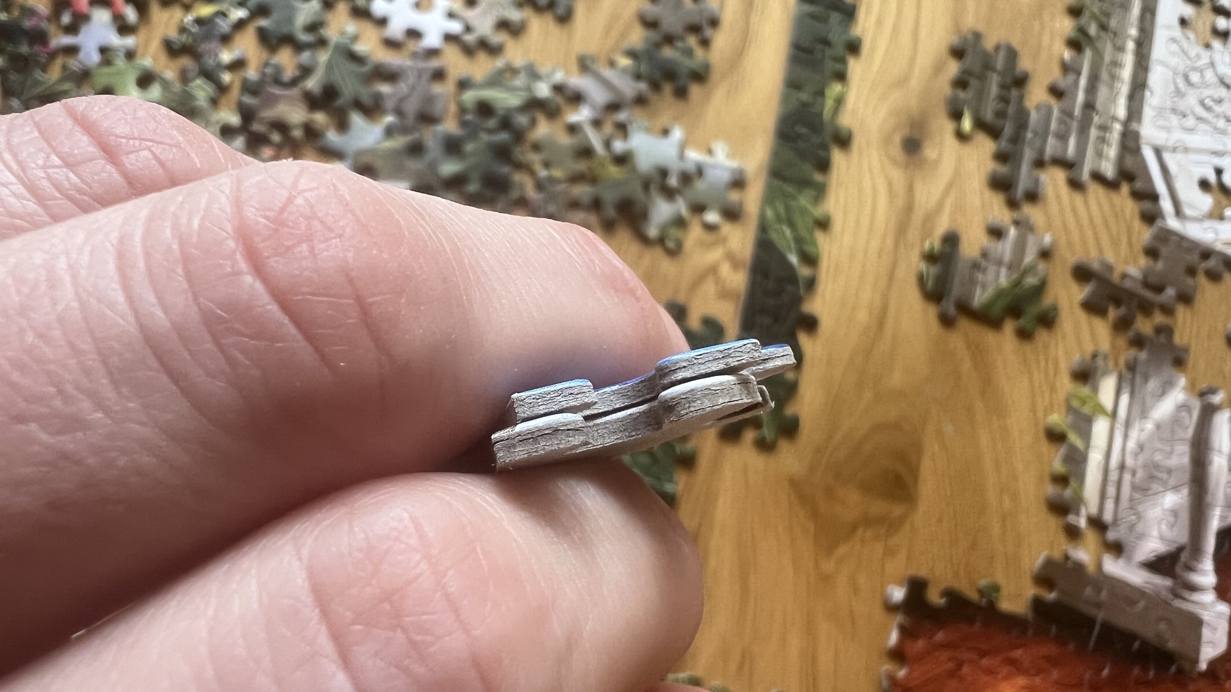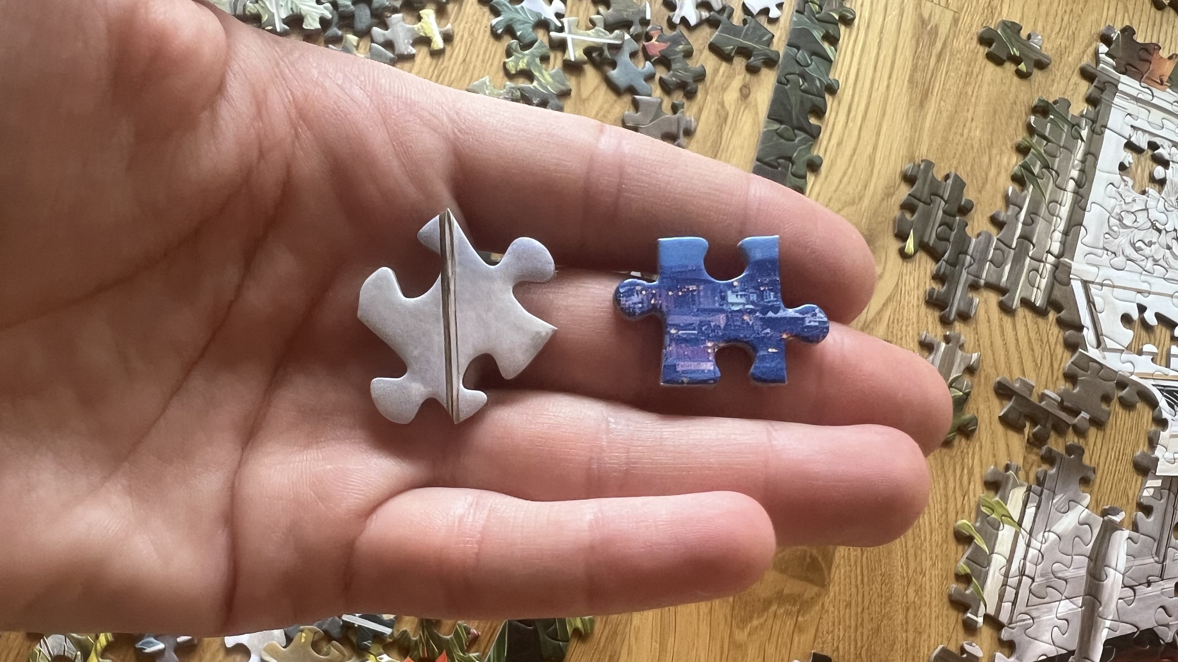 Хотя, если сравнивать качестсво, Черри выигрывает. Как видите, кусочки разные по толщине. На фото нижний элемент Cherry Pazzi, верхний Castorland: