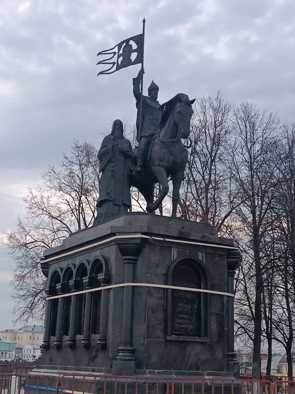 Потом я пошла чуть в сторону и увидела памятник. Там две фигуры: князь Владимир и святитель Фёдор. Князь Владимир изображён верхом на коне, в воинских доспехах.