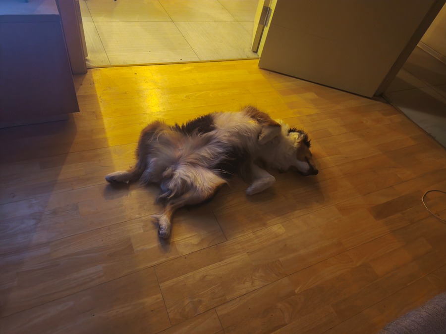 Какого-то конкретного места себе она так и не выбрала, но любила забираться куда-то в закрытое пространство, под стол, под кровать, предпочитала быть со мной в одной комнате, иногда на диване, но в основном в ногах на полу. В целом вела себя спокойно, цивилизовано, удивил такой характер еще молодой собаки.