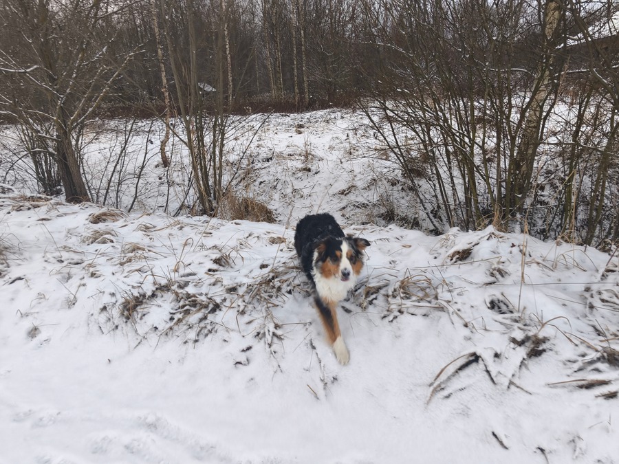 Прогулки с одной стороны были интересными, с другой - довольно напряженными. Приходилось все время держать ее на поводке, пока не уходил в места, где нет людей и животных. Снега было много и она с удовольствием скакала по сугробам и вынюхивала мышей, правда никого не поймала. Гулять с аусси надо много, иначе дома будет заставлять кидать мячик и играть с ней долгое время. Если же вымотать ее на улице - то только поест и ложится спать.