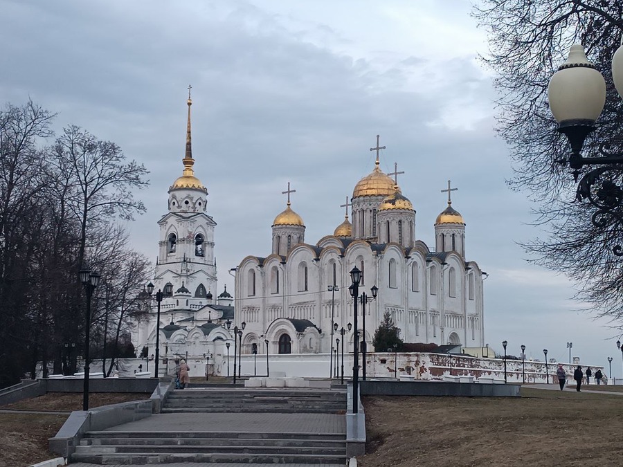 Собор стоит на холме над рекой Клязьмой. Его золотые купола видно издалека. Я шла по Большой Московской улице, смотрела на старинные дома — и вдруг увидела собор прямо перед собой. Он большой, белокаменный, с красивой резьбой на стенах и дверях. Сразу понятно, что здание очень старое.