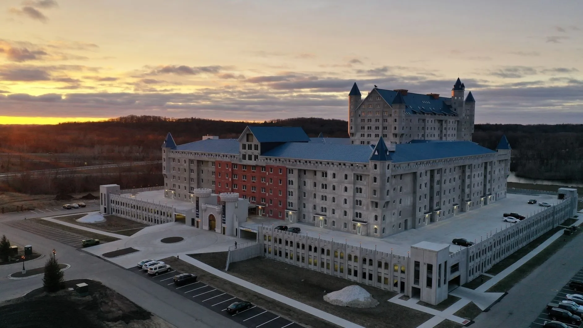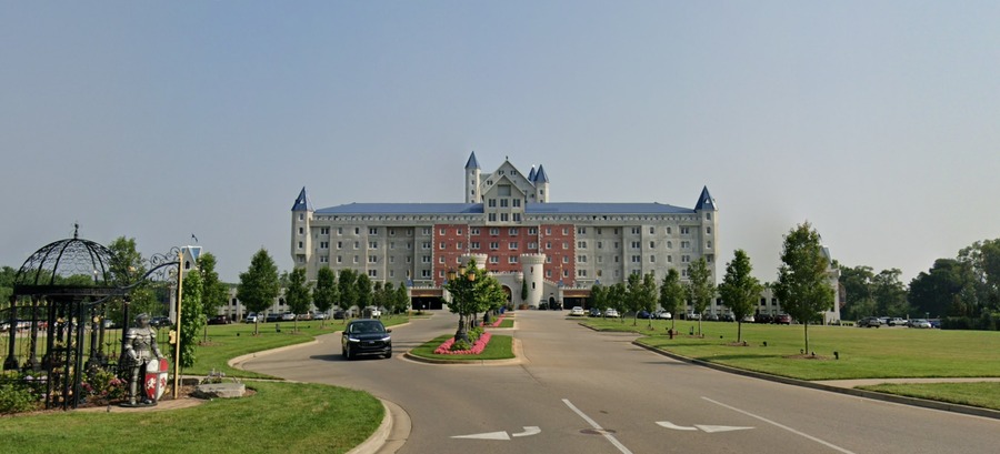 В США в штате Мичиган есть такой городок Гранд-Рапидс. Там один застройщик построил жилой комплекс пол названием Grand Castle, что можно перевести как Большой замок. Это не застройка из 90-х, это современное здание, которое строилось с 2015 по 2018 год. Вид на "замок" с просмотра улиц гугл карт: